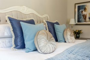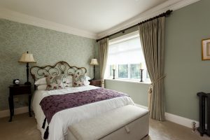 All of the curtains are hung from substantial dark oak wooden poles, and all the fabrics are from leading fabric houses such as Colefax and Fowler, Zoffany, Sanderson, William Morris, Robert Allen to name just a few. The fabrics used include classic damasks, intricate embroidered patterns, plain linens, silks and woven jacquards. The curtains are dressed into ornate tiebacks, some made from cut glass, feathers and painted wood. Gorgeous trimmings were added to customise and embellish the cushions for the seating areas and bedrooms.